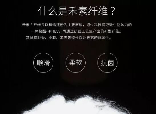 禾素纤维是以淀粉制造的葡萄糖为主要原料,来大量培养一种选定的微生物,然后提取微生物体内的一种聚酯(类似于哺乳动物的脂肪)---PHBV,再通过复杂的工艺提取,再纺丝而成的新型纤维。由禾素纤维纺织而成的面料,不仅在触感上和蚕丝有着很多相似性:柔软、顺滑、凉爽等,其天然持久的抗菌性,更是有别于其他抗菌材料。