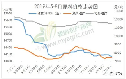 据了解,自5月份以来棉花3128B价格累计下跌1649元/吨,跌幅11.60%;涤纶短纤价格累计下跌1250元/吨,跌幅14.45%;粘胶短纤价格累计下跌800元/吨,跌幅7.02%。可以看到,需求的疲软、供大于求的供需矛盾,使得三大纺织原料价格均有大幅的下跌,原料作为纺织产业的源头,原料行情尚且如此,可见下游需求之差,大环境之不好。