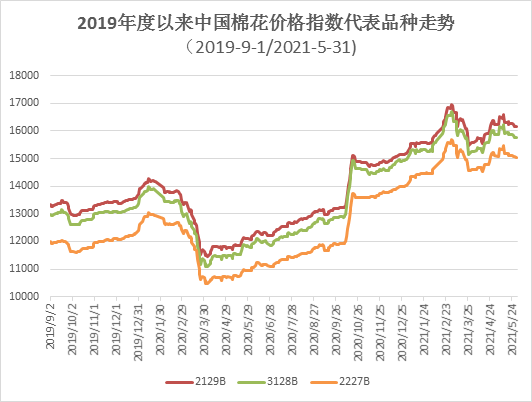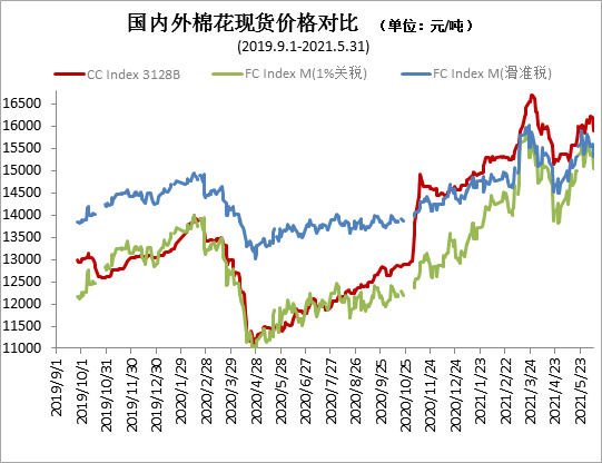 5月,国内棉花价格受大宗商品市场走势影响,呈现月初上涨然后回落的走势,但月度均价仍较上月有所上涨。纺织企业定单较为充足,开工率较高,原料库存有所下降,部分纺织企业借棉花价格回落的机会积极入市,大量补充原料库存,需求量较上月明显增加。月底,中国棉花价格指数(CCIndex3128B)为15760元/吨,环比下跌112元;月均价为15950元/吨,环比上涨383元,同比上涨4306元。